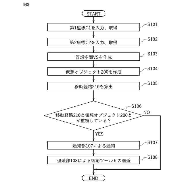 【解決手段】仮想オブジェクト作成部104により仮想空間VSに仮想オブジェクト200が作成される。経路算出部105は、仮想空間VSにおいて移動経路210を算出する。移動経路210は、切削加工機10の加工ツール6が移動する経路に相当する。判定部106は、移動経路210と仮想オブジェクト200とが重複するか否かを判定する。これにより、加工ツール6がオブジェクトに衝突するか否かを把握することができる。