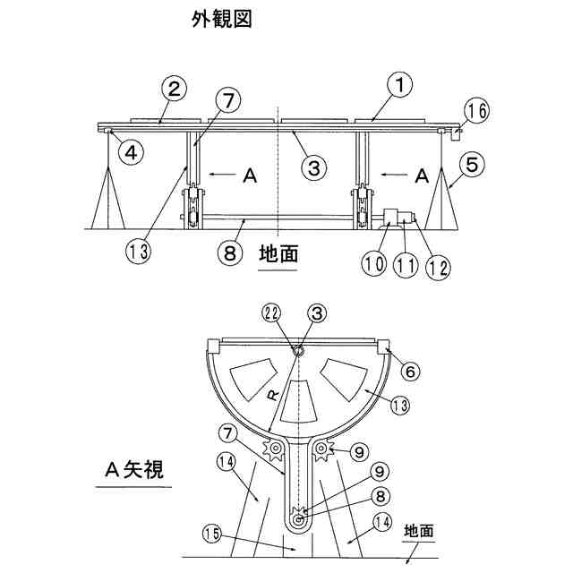 太陽光パネル傾斜図 駆動シャフト8が回転することにより、スプロケット9が回転してチェーン駆動して、太陽光パネルが傾斜した図です。