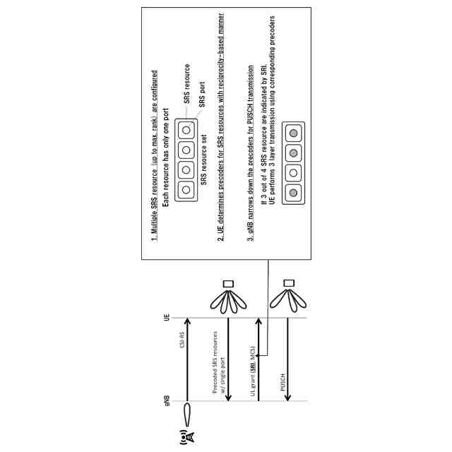 非Codebookベースの送信方式の場合、UEは、gNB(基地局)から受信するチャネル状態情報推定用参照信号(CSI-RS:Channel-State Information Reference Signal)に基づいて、基地局へ送信する参照信号(SRS: Sounding Reference Signal)のプリコーダを計算する。UEは、計算したプリコーダによりプリコーディングされたSRSをアップリンクにより送信する。基地局はUEから受信したSRSを分析し、上りリンクの無線チャネルの品質情報を収集することにより、適切なリソースの割り当てや、ビームフォーミングの管理、干渉の軽減等のマネジメントを行う。