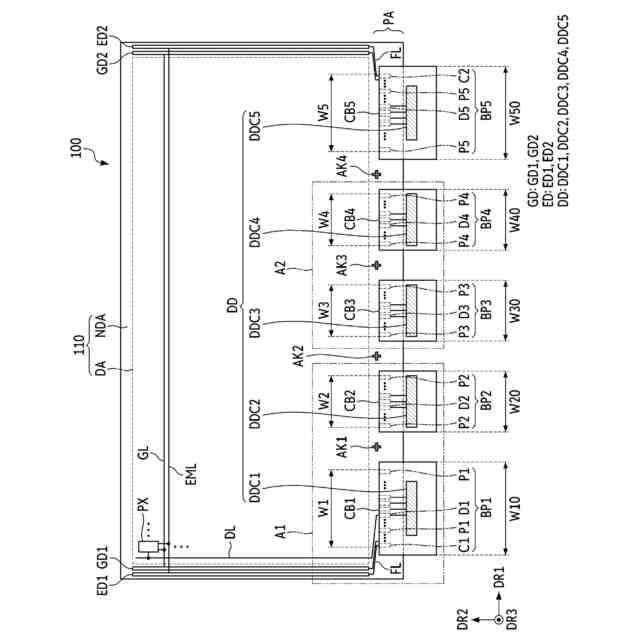 【解決手段】表示パネル;前記表示パネルの表示領域に配置された画素;前記表示パネルの非表示領域に連結された複数の回路ボード;及び、前記複数の回路ボード上の複数の駆動回路を含み、前記複数の回路ボードのそれぞれは前記非表示領域のパッドに連結された一つのクラスタ端子(端子群)を含み、前記クラスタ端子(端子群)は当該回路ボード上で隣接するように配置された複数の端子を含み、少なくとも2個の回路ボードのクラスタ端子(端子群)は互いに異なる大きさの幅(複数の回路ボードの配列方向における寸法)を有する。