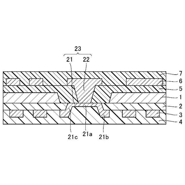 金属コア層を用いた配線回路基板の一例を図5に示す。図5に示すの配線回路基板は、貫通孔を有する金属コア層51と、金属コア層51の一方の面上に配された第一絶縁層52と、金属コア層51の他方の面上に配された第二絶縁層55と、第一絶縁層52の上に配された第一配線層53と、第二絶縁層55の上に配された第二配線層56と、第一配線層53を覆う第三絶縁層54と、第二配線層56を覆う第四絶縁層57と、金属コア層51の貫通孔を貫通し、第一配線層53と第二配線層56とを電気的に接続し、かつ金属コア層51とは電気的に接続しない層間接続部73とを有する。そして、層間接続部73は、金属コア層51の厚み方向に並んだ、第一層間接続部71と第二層間接続部72とを有する。ここで、第一層間接続部71と第二層間接続部72との位置が設計上の位置から少しずれた場合でも、第一層間接続部71と第二層間接続部72とが確実に電気的に接続するように、第一層間接続部71は第二層間接続部72よりも大きな直径を有する。