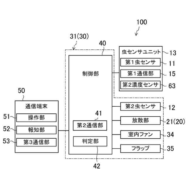 第1の態様では、気流生成部(34)が対象空間(S)の空気をガスセンサ(10)の検知領域に搬送するので、例えば複雑な間取りや面積の広い対象空間(S)であっても、対象空間(S)の構造に関係なく、対象空間(S)に対象虫種の虫(I)がいる場合には該虫(I)の発するガスをガスセンサ(10)の検知領域に搬送できる。これにより、対象空間(S)に存在する虫(I)の検出精度を向上できる。そして、制御部(40)は検出精度が向上したガスセンサ(10)の検出値に基づいて駆除部(20)を制御するので、対象空間(S)に存在するガスを発する虫(I)又は該虫(I)と同一種の虫(I)を確実に駆除できる。これにより、対象空間(S)の虫を低減することができる。