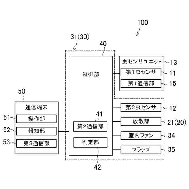 第2の態様では、制御部(40)が対象空間(S)の空気を攪拌する第1運転を実行するので、対象空間(S)の空気が攪拌されることで虫(I)が発するガスをより確実にガスセンサ(10)の検知領域に搬送できる。これにより、ガスセンサ(10)で虫(I)のガスをより確実に検出できる。