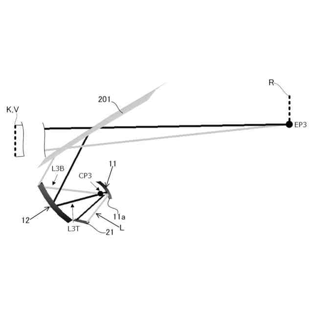 備える。表示光Lは高さ方向においてクロス点CP2,CP3で交差する。第1ミラー11の反射面11aの一部は、クロス点CP2,CP3を結ぶ線分を直径Dとした仮想