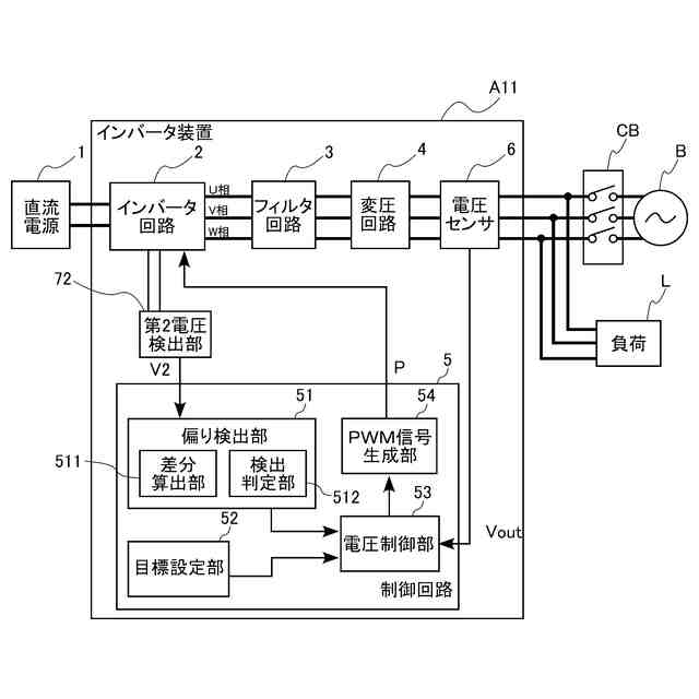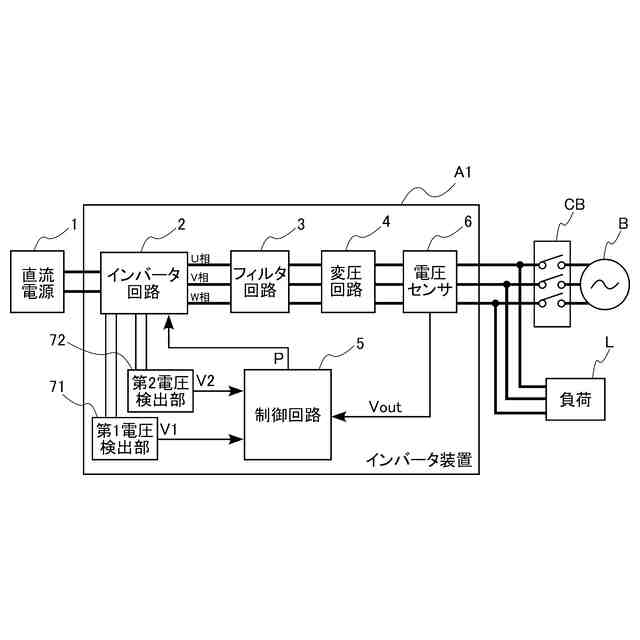 【解決手段】インバータ装置A1は、直流電源が出力する直流電力を交流電力に変換して出力する。インバータ装置A1は、直流電源1の電源電圧を分圧して中性点電位を発生させる分圧部を含むインバータ回路2(マルチレベルインバータ回路)と、インバータ装置A1の出力電圧が当該出力電圧の目標値となるようにインバータ回路2の制御を行う制御回路5と、を備える。制御回路5は、中性点電位の偏りが発生しているか否かを検出する偏り検出部を含み、且つ当該偏り検出部が中性点電位の偏りの発生を検出すると、出力電圧の目標値を低下させる。