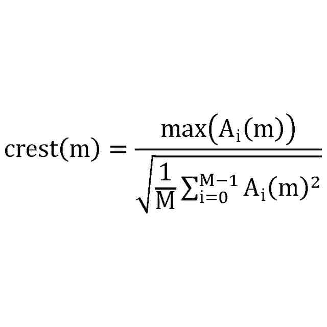 に従って前記ピークネス尺度を取得することを含み、式中、crest(m)がフレームmの前記ピークネス尺度を与える、請求項6に記載の方法。