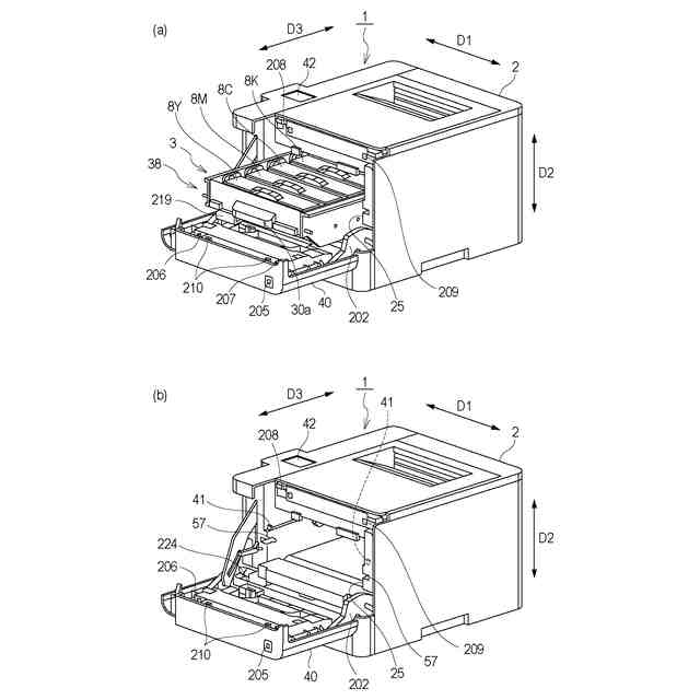 また、カートリッジトレイが有する感光ドラムのドラム回転軸線上に延びる方向をD1方向(第2方向)とする。更に、D1方向に対して交差する方向(本実施形態では、カートリッジトレイに対する現像カートリッジの挿入方向)をD2方向(第3方向)とする。加えて、カートリッジトレイが画像形成装置内に挿入される方向をD3方向(第1方向)とする。D1方向とD2方向とは、互いに交差もしくは直交する。D2方向とD3方向とは、互いに交差もしくは直交する。D3方向とD1方向とは、互いに交差もしくは直交する。本実施例において、D2方向は鉛直方向であり、D3方向は、D1方向とD3方向の双方に直交する方向である。