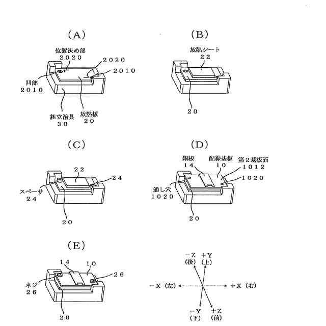 また、図5(B)では、スペーサ240の一端(上端)を配線基板100の第1基板面101に当接すると共に、スペーサ240の他端(下端)を放熱板200の表面に当接し、配線基板100の通し穴とスペーサ240の中空部に第2基板面102側からネジ260を挿通し、放熱板200に形成されたネジ穴にねじ260をねじ込んで、スペーサ240を間に介して配線基板100と放熱板200を締結固定することで、配線基板100と放熱板200の間に空間を形成した状態で配線基板100に放熱構造を組み付けている。