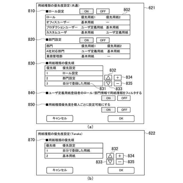 前記優先度設定手段は、前記各ユーザ属性、認証中ユーザによって登録された用紙種類、前記第1用紙種類、及び前記第2用紙種類のうちから選ばれた1つ以上にそれぞれ前記優先度を設定可能としている、