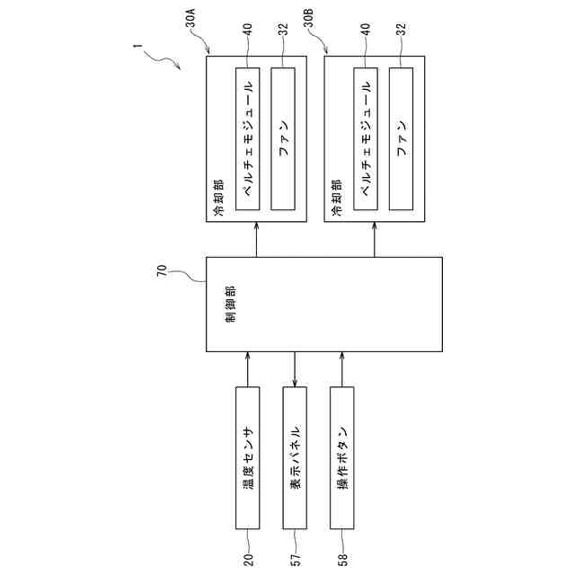 特許文献1には、ペルチェ素子と、ペルチェ素子に取り付けられ、ペルチェ素子の発熱面により温度が上昇するヒートシンクと、温度が上昇したヒートシンクのフィンの隙間に空気を通す送風装置とを有する保冷器が開示されている。