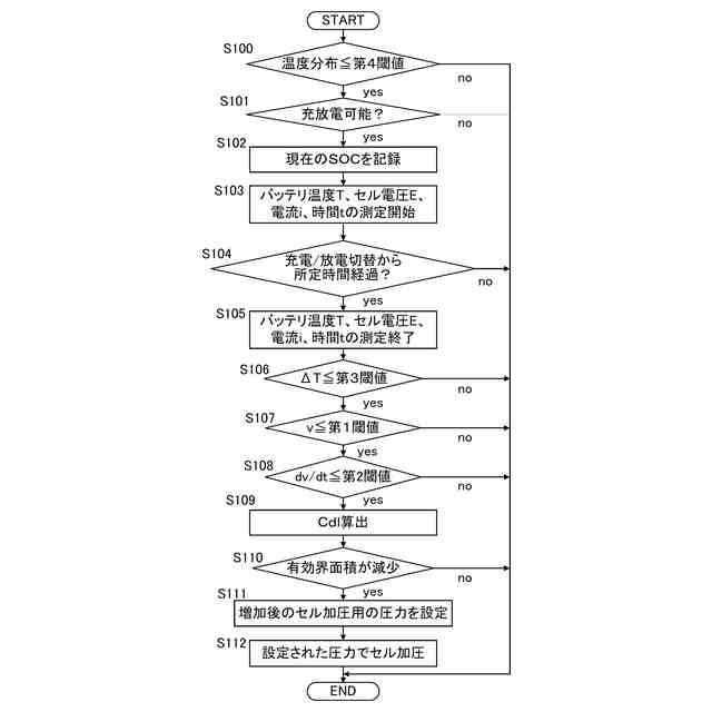 【解決手段】積層された複数の発電要素を備える電池スタックに積層方向からセル加圧力を付与する加圧機構の、セル加圧力の変更の要否を判断する電池劣化診断方法において、コントローラが、発電要素の充放電切り替えに伴う電圧変化時における電流値の変化量に基づいて電気二重層容量を算出し、電気二重層容量に基づいて、正常な状態に対する有効界面積の増減を推定し、有効界面積が減少していると推定した場合はセル加圧力を増大させる必要があると判断し、減少していないと推定した場合はセル加圧力を変化させる必要がないと判断することを特徴とする電池劣化診断方法。