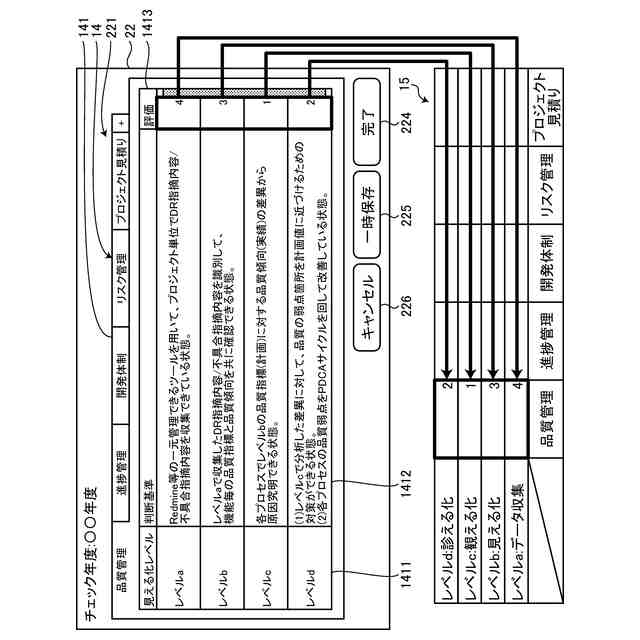 従来、業務プロセスの品質を高めるために、あらかじめ決められたプロセスを多段階評価することが行われている。特許文献1には、事業体の品質管理システムの規定されたプロセスについて、汎用的な品質管理基準に照らし合わせた質問への回答をすることにより多段階評価する業務プロセス支援システムが記載されている。