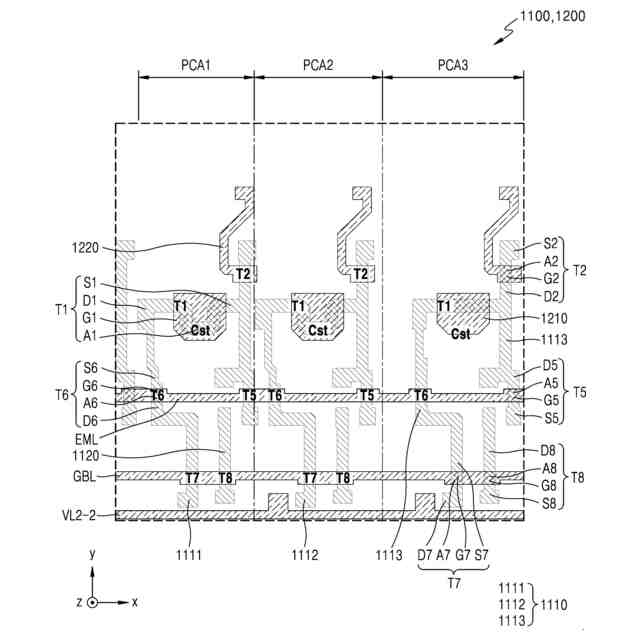 一実施形態において、前記第1導電層上に配置されていて、前記第1画素回路に連結される第1画素電極、及び、前記第2画素回路に連結される第2画素電極を含む第2導電層と、前記第2導電層上に配置されていて、前記第1画素電極に重畳する第1画素開口、及び、前記第2画素電極に重畳する第2画素開口を画定(定義)する画素画定(定義)膜と、をさらに含み、平面視において、前記第1データラインは、前記第1画素開口及び前記第2画素開口から離隔して配置されうる。