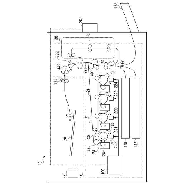 図1において、画像形成装置10は、コントロールパネル13、無線タグ通信装置201、及びプリンタ部18を備える。プリンタ部18は、制御部100、給紙カセット161、162等を備える。制御部100は、コントロールパネル13、無線タグ通信装置201、及びプリンタ部18を制御する。制御部100は、プリンタ部18におけるシートの搬送を制御する。シートの搬送の制御とは、シートの搬送タイミング、シートの停止位置、シートの搬送速度等を制御することである。