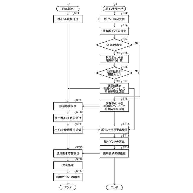 ポイントの使用の一例として、1ポイントを1円換算して商品の購入費用の一部に充てることができる。会員は、使用するポイント数(以降、使用ポイント数という)を店員に伝え、店員は会員から伝えられた使用ポイント数をPOS端末に入力する。このようにして、会員はポイントを使用することができる。