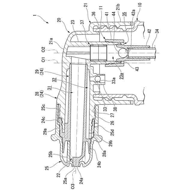 基筒部に形成された2つの突片のうち、ノズル周方向で互いに対向する面と反対側の面が、本体筒部の外装筒に形成された導入孔の内面のうち、ノズル周方向で互いに対向する面に当接、若しくは近接しているので、基筒部および本体筒部を、容易にノズル周方向の相対位置を合わせて組み付けることができる。