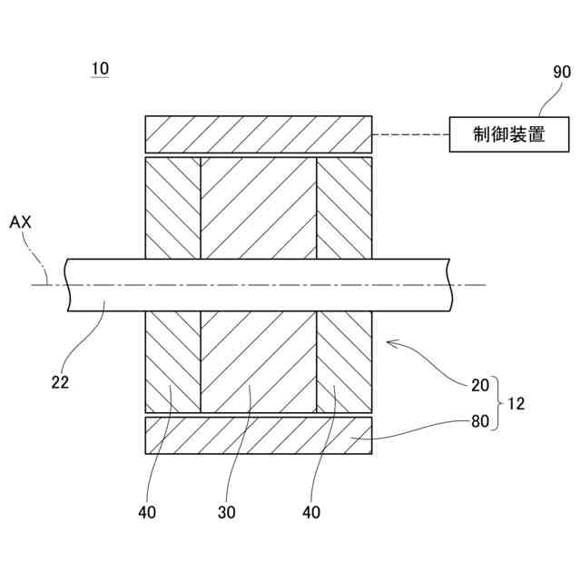 ロータ20は、シャフト22、固定ロータコア30、及び、2つの回動ロータコア40を有している。シャフト22の中心軸は、回転軸AXである。固定ロータコア30と回動ロータコア40のそれぞれは、高い透磁率を有する材料により構成されている。固定ロータコア30と回動ロータコア40のそれぞれは、中心に貫通孔が設けられた円筒形状を有している。固定ロータコア30と回動ロータコア40のそれぞれの中心孔内にシャフト22が挿通されている。固定ロータコア30は、シャフト22に固定されている。各回動ロータコア40は、回転軸AXを中心としてシャフト22に対して相対的に回動可能である。