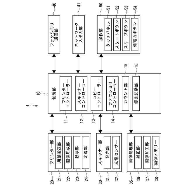 画像形成装置1は、プリンター機能、スキャナー機能、コピー機能、ファクシミリ機能を含む複数の機能のうち少なくとも2つの前記機能を有する。画像形成装置1は、各々の機能を使用した使用回数を数えて記憶するカウント部15と、電源起動時またはスリープモードから動作可能な状態への復帰時に、カウント部15に数えられた使用回数が予め設定された閾値に達しているか否かを判定し、閾値に達している使用回数の中で少なくとも最多の使用回数となった機能を通常待機モードで起動する優先起動部16と、を備えている。