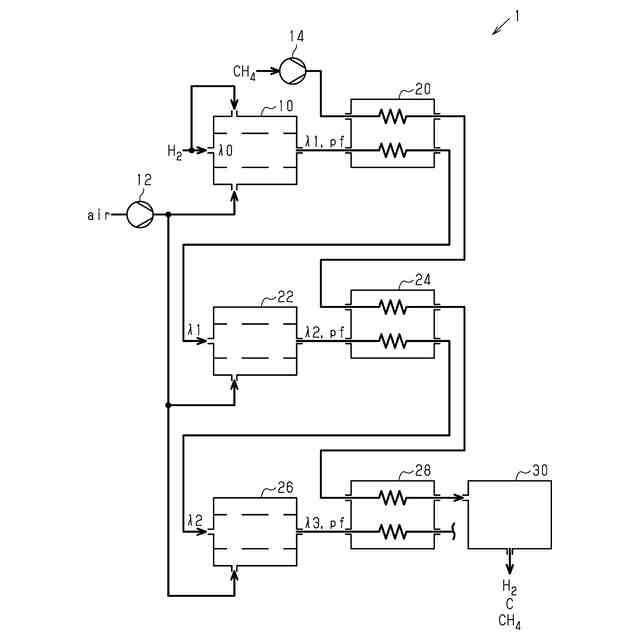 図1に、水素生成システム1の構成を示す。図1に示すバーナ10には、燃料としての水素と、圧縮機12によって加圧された空気とが供給される。なお、水素についても大気圧よりも高圧で供給されることが望ましい。
