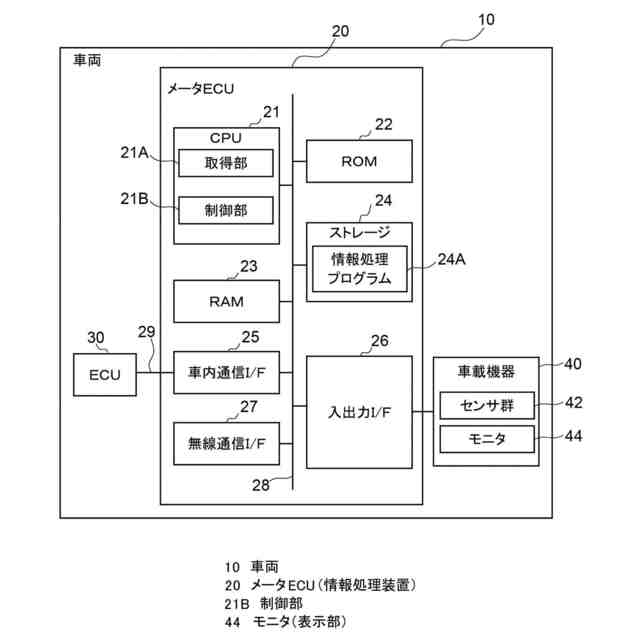 図1は、車両10のハードウェア構成を示すブロック図である。図1に示すように、車両10は、メータECU(Electronic Control Unit)20を備えている。メータECU20は「情報処理装置」の一例である。