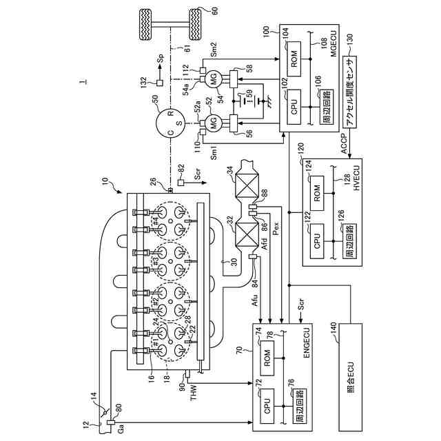図1は、一実施形態に係る車両1の構成を示す図である。図1に示す車両1は、当該車両1の走行のための駆動源として、エンジン10、第1モータジェネレータ52、第2モータジェネレータ54、ENGECU70、MGECU100、およびHVECU120を備える。