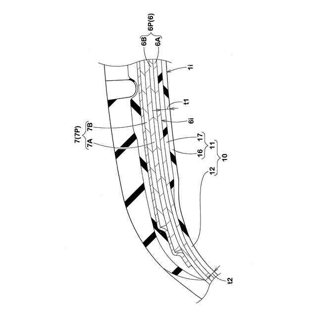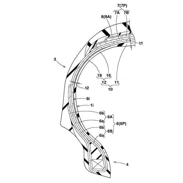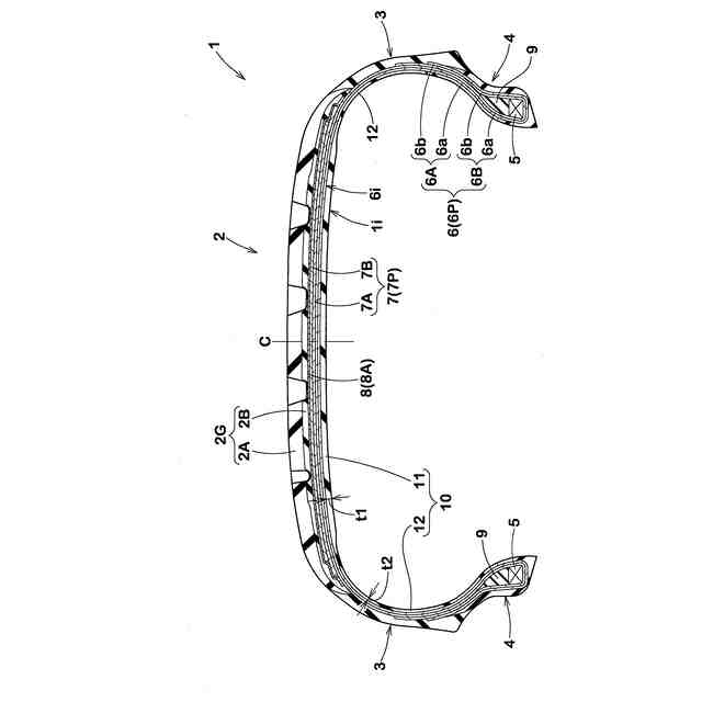 前記内側ゴムは、前記トレッド部を第1厚さで延びる第1部分と、前記一対のサイドウォール部を第2厚さで延びる第2部分とを含み、