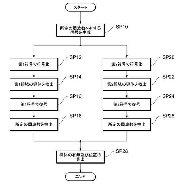 また、前記検出部は、前記復号部によって前記第1符号に従って復号された信号から前記所定の周波数を有する信号を抽出する第1抽出部と、前記復号部によって前記第2符号に従って復号された信号から前記所定の周波数を有する信号を抽出する第2抽出部と、前記第1抽出部が抽出した信号及び前記第2抽出部が抽出した信号に基づいて前記第1領域及び前記第2領域における物体の有無及び位置を算出する算出部と、を有する。