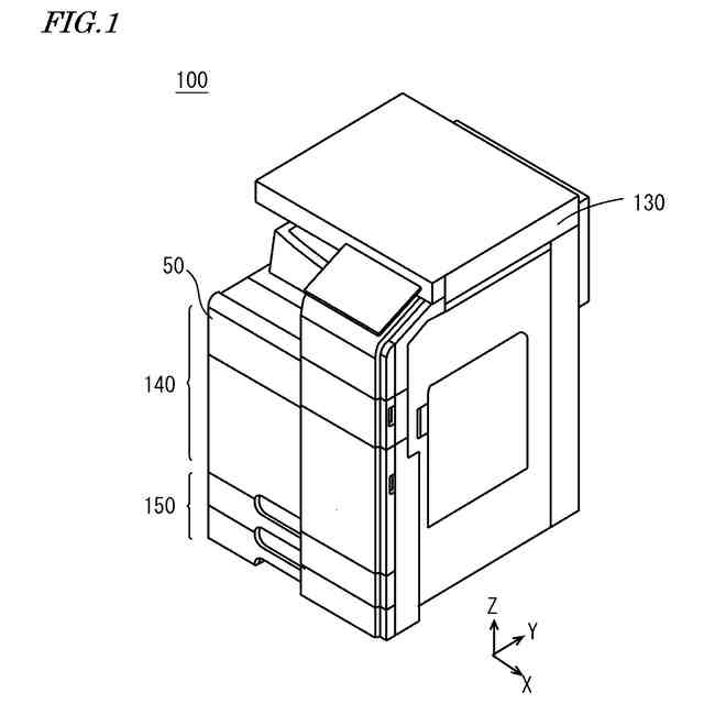 図1は、本発明の実施の形態の1つにおけるMFPの外観を示す第1の斜視図である。図1を参照して、MFP(Multi Function Peripheral)100は、画像形成装置の一例であり、その前面に本体ケースの一部を構成するカバー部材50を備える。カバー部材50は、開閉可能であり、図1においては、カバー部材50が閉じた閉状態におけるMFP100を示している。図1において、互いに直交するX方向、Y方向およびZ方向が定義される。X方向およびY方向は水平面に平行である。以下の説明では、X方向は、画像形成装置1の左右に平行な方向とし、左右方向ともいう。X方向正側が右方であり、X方向負側が左方である。Y方向は、画像形成装置1の奥行方向に平行な方向とし、前後方向ともいう。Y方向負側が前方向であり、Y方向正側が後方向である。Z方向は、画像形成装置1の上下方向に平行な方向であり、上下方向ともいう。Z方向正側が上方向であり、Z方向負側が下方向である。