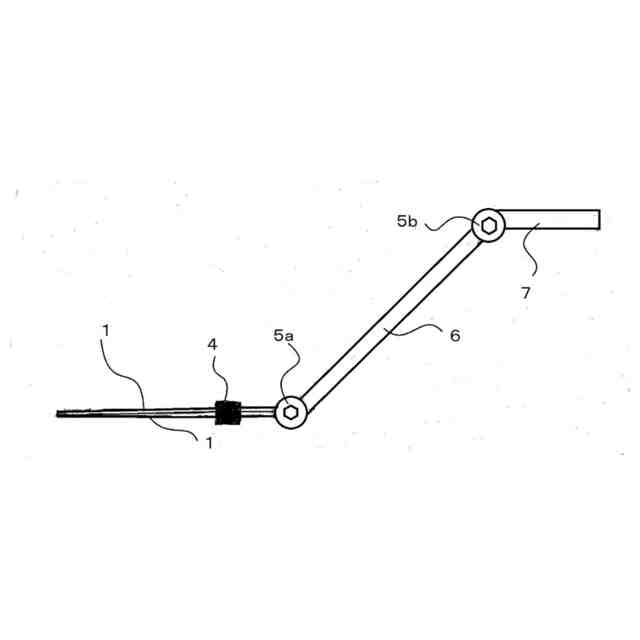 図1は本発明の草刈り鋏の外観図である。図2は本発明の草刈り鋏の側面図である。図1及び図2において、1は鉄又はステンレス鋼等の金属で形成された一対の刃体であり、刃体1の一側には刃部2を備えている。この一対の刃体1は支軸部4により刃体が開閉可能に軸支されている。また、前記刃体1は刃部2側が凸状になるように湾曲しており、刃部2には先が鋭角の2つの突起が連設し外周縁部が略М字形状の切刃3が所定間隔で複数連設されている。さらに、刃体1の基部には一対の柄部6の一端部が刃体1との角度を自由に変えられるように連結部5aにより、刃体1の開閉方向と直行する方向に回動自在に連結されており、柄部6の他端部には把持部7が角度を自由に変えられるように連結部5bにより刃体1の開閉方向と直行する方向に回動自在に連結されている。