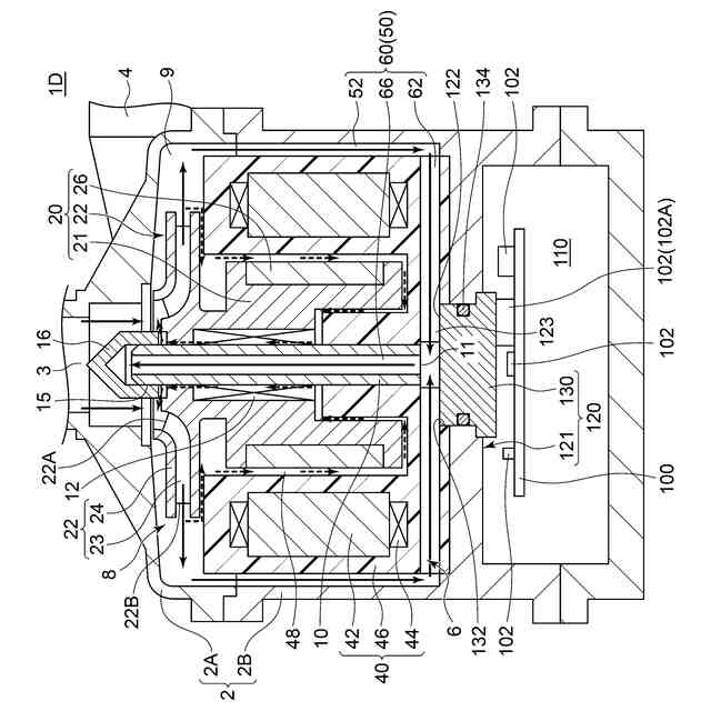 前記第1流路の下流端に接続され、前記マグネット及び前記ステータコアの径方向内側において、前記マグネット及び前記ステータコアが占める軸方向位置範囲を通過する第2流路