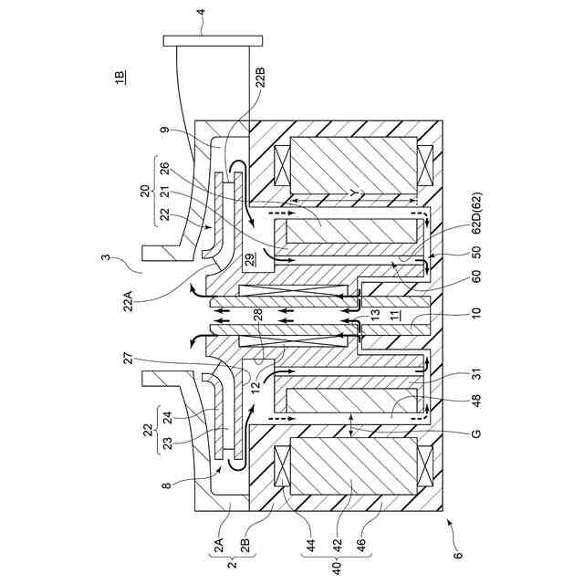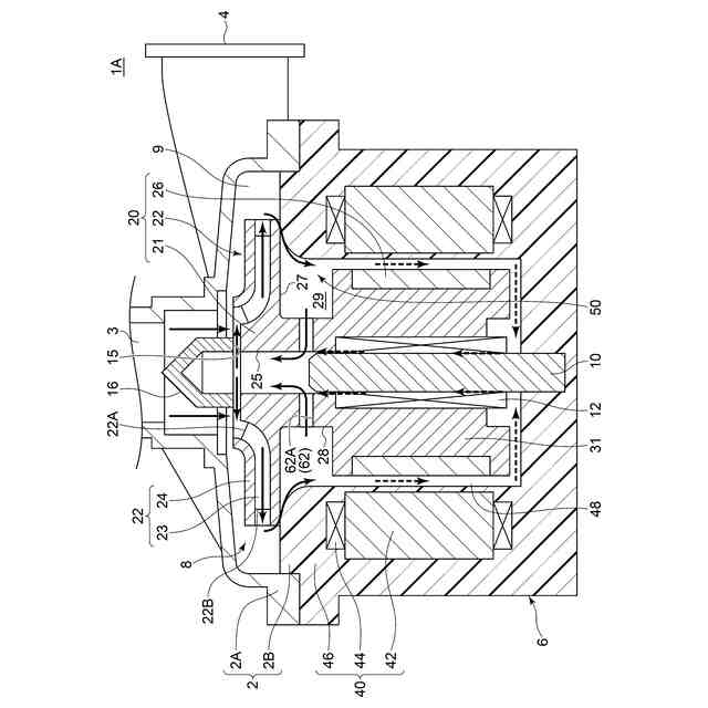 リターン流路は、ロータとステータとを隔てる空隙をバイパスするように、インペラの背面側において空隙よりも内側の径方向位置に設けられるバイパス路を含む。