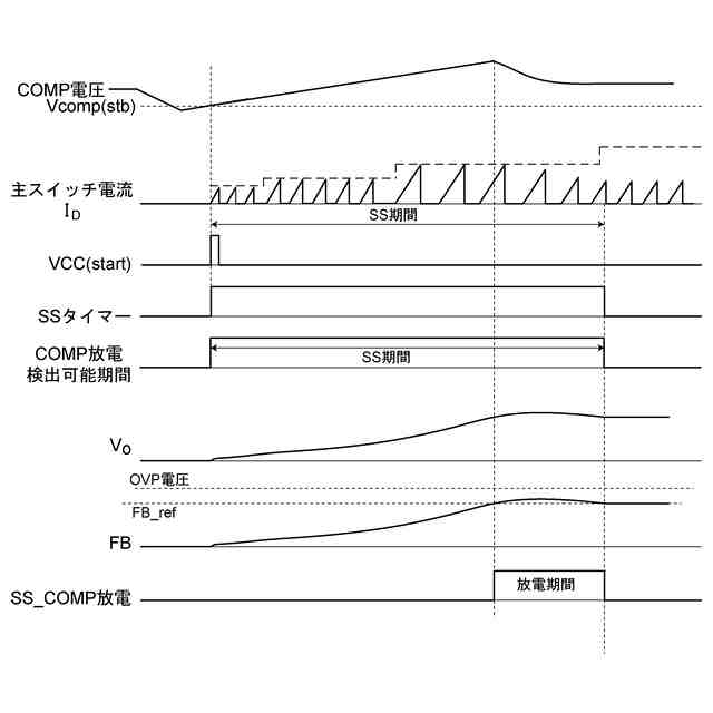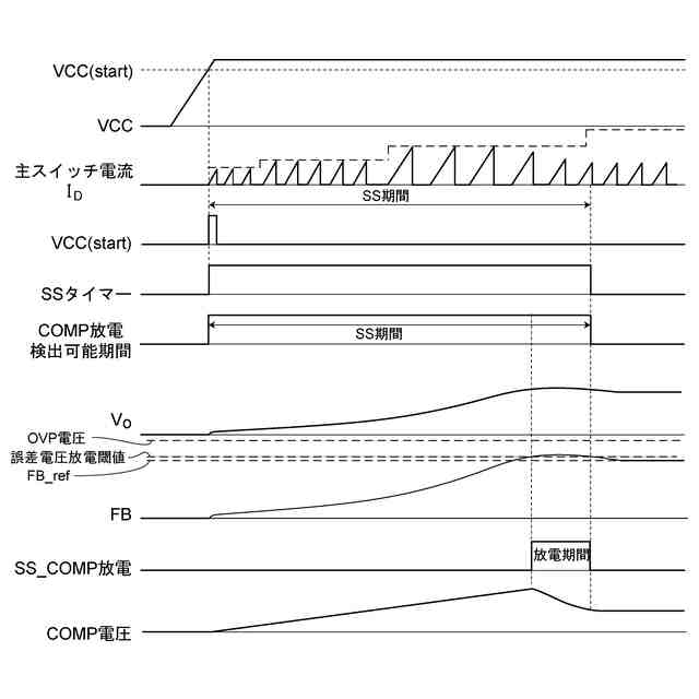 【解決手段】スイッチング電源1の起動電圧Vccが所定の起動閾値電圧を超えたとき又はCOMP電圧が所定のスタンバイ電圧以下になった後に再びスタンバイ電圧を超えたときにはソフトスタート期間を設けるソフトスタート制御部130と、ソフトスタート期間に基づいてCOMP電圧を放電することが可能な誤差電圧放電可能期間を設定する誤差電圧放電可能期間設定部140と、誤差電圧放電可能期間内において、帰還電圧FBが所定の誤差電圧放電閾値を超えたときから、誤差電圧放電閾値を下回るとき又はCOMP電圧が発振停止電圧まで低下したときのうちのいずれか早いときまでの期間を放電期間とし、当該放電期間内にCOMP電圧を放電する誤差電圧放電部170とを備えることを特徴とする制御回路100。