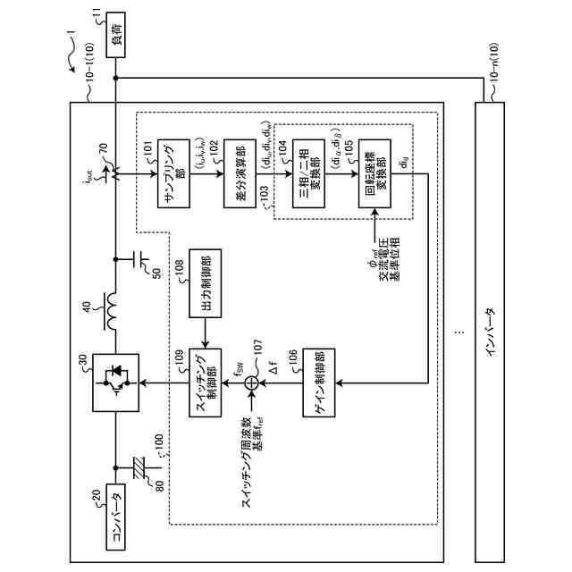 特許文献1に開示の技術は、低周波の横流の発生を抑制することはできるが、複数のインバータ間でPWM(Pulse Width Modulation)信号が同期していない場合は、複数のインバータ間に高周波の横流が流れてしまう可能性がある。特許文献2に開示の技術は、複数のインバータ間でPWM信号を同期させることができるが、PWM信号を同期させるための専用の回路を追加する必要があるため、コストが高くなったり、装置が大型化したりする可能性がある。特許文献3に開示の技術は、今回のスイッチング周波数の調整量を判定するためには、出力電流の高周波成分の今回の検出値、前回の検出値及び前回のスイッチング周波数の調整量に基づく必要がある。このとき、高周波の検出結果に有意な変化を発生させるために、スイッチング周波数を大きく変化させる必要があるので、スイッチング周波数の安定化に課題がある。また、複数のインバータにおいて負荷変動がある場合に、複数のインバータ間で同じ方向のスイッチング周波数を増減させてしまう可能性があり、スイッチング周波数の制御が不安定になってしまう可能性もある。