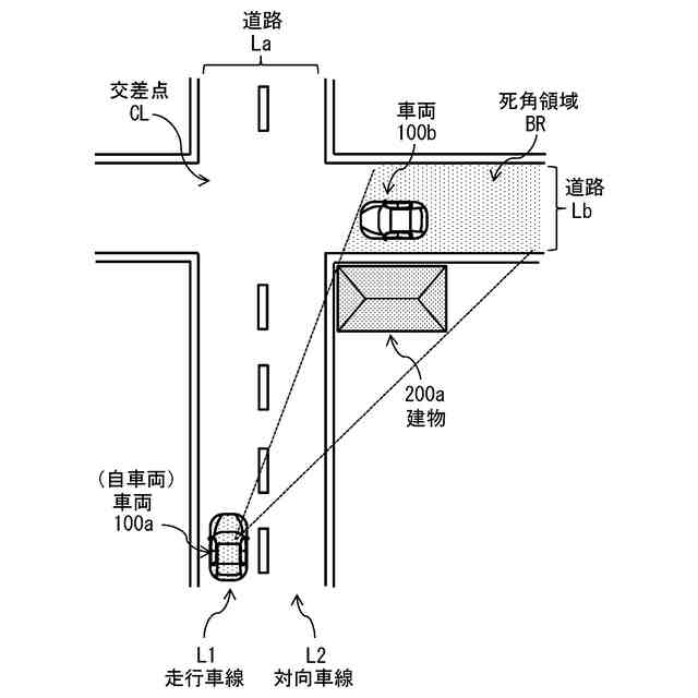 第1の車両の前方に死角領域が存在することを示す第1のデータと、前記死角領域に存在すると予想される第2の車両から発せられる音についての第2のデータと、第2の車両の周辺の環境についての第3のデータとを取得することの可能な取得部と、