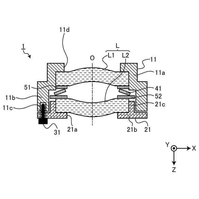 【解決手段】レンズL1およびレンズL2と、レンズL2を収容するレンズホルダ21と、一端側にレンズL1が収容され、レンズL2が収容されたレンズホルダ21が他端側から挿入される鏡筒11と、レンズホルダ21を光軸Oの方向に移動させる調整ボルト31と、鏡筒11内のレンズL2とレンズL1との間に介在され、レンズL1,L2に対し荷重を印加する円環形状の弾性体である皿ばね41と、を備える。