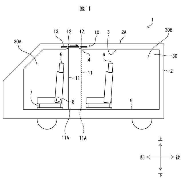 以下、本開示の一実施形態について、図1を参照して詳細に説明する。図1は、実施形態1に係るパーティション装置10の構成を示す概略図である。なお、説明の便宜上、図1等に矢印にて示すように、車両1の前後方向、左右方向、及び上下方向を定義する。左右方向は車両1の車幅方向である。