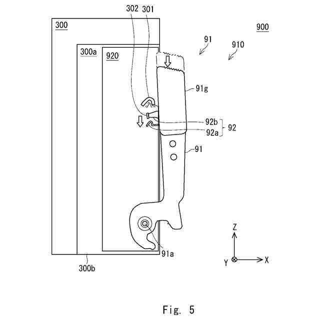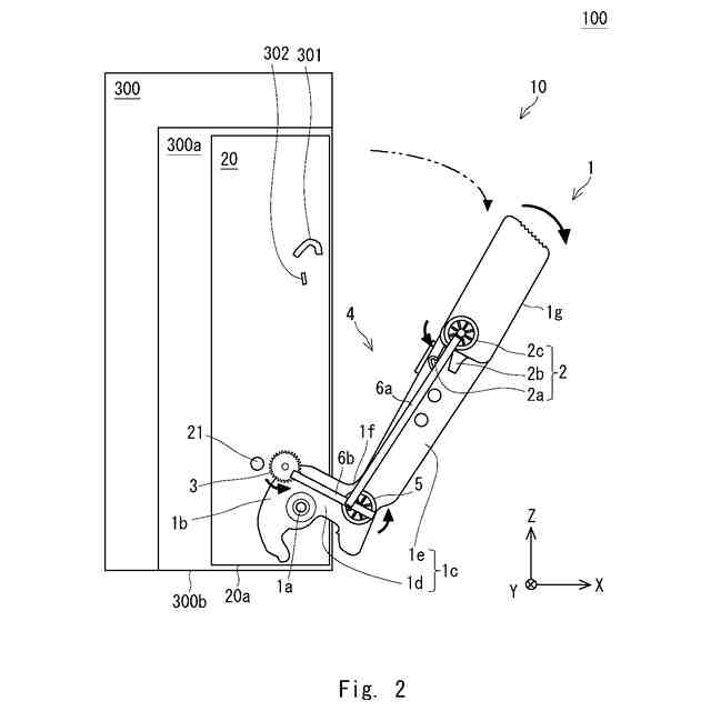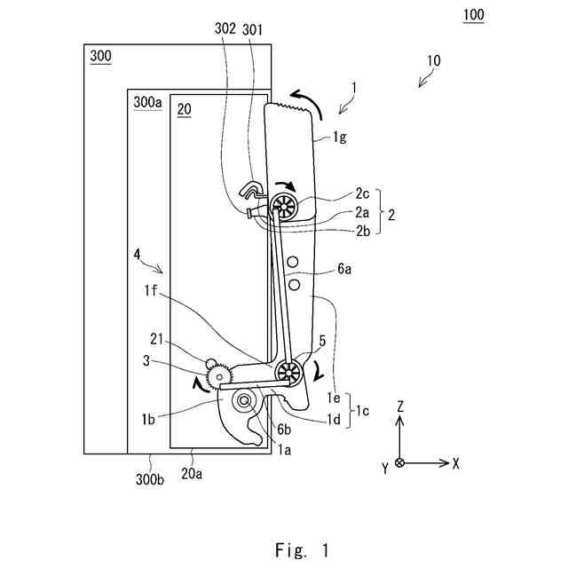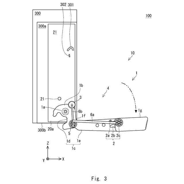 前記基板が前記ロック機構にロックされ、前記レバーが前記基板から離隔する方向に回転すると、前記歯車が前記歯車引っ掛け部に当接して回転し、前記伝達機構が前記歯車の回転による力を前記ロック機構に伝達し、前記第1の突起を回転させて前記装置からレバー側へ離隔させて、前記レバーの内側に収納する、