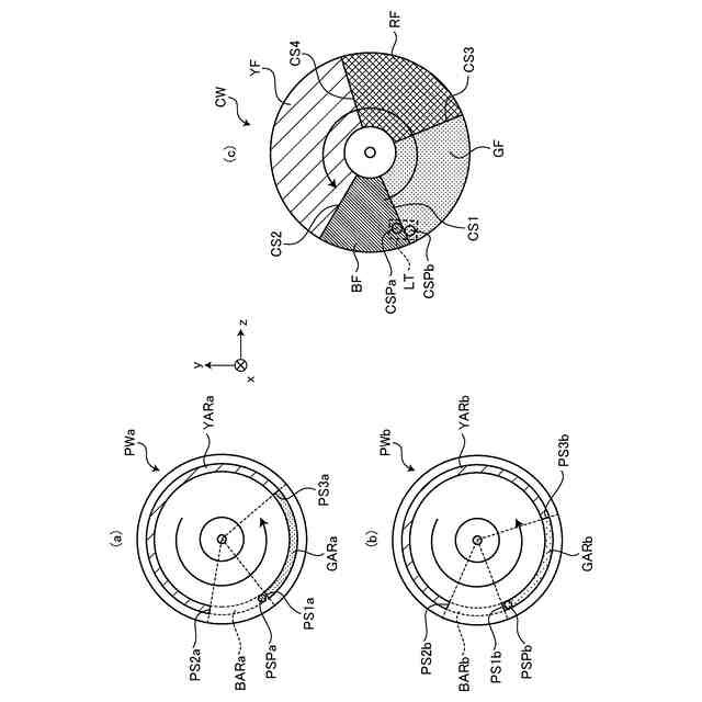 回転体の円周領域に複数のダイクロイックフィルタ等の複数のフィルタを配置した円盤状のカラーホイールを回転させることによって、当該複数のフィルタを順次切り替え、それぞれのフィルタで得られる色を照明光とする照明技術が一般的に知られている。カラーホイールを利用する際には、フィルタの境界部(スポーク)が光源光のスポットを通過する時間(スポークタイム)において、隣り合う異なる透過特性を有するフィルタが当該スポットを通過するため、当該時間内では混色が生じる。このスポークタイムはなくすことはできないため、混色する時間を短縮する必要がある。