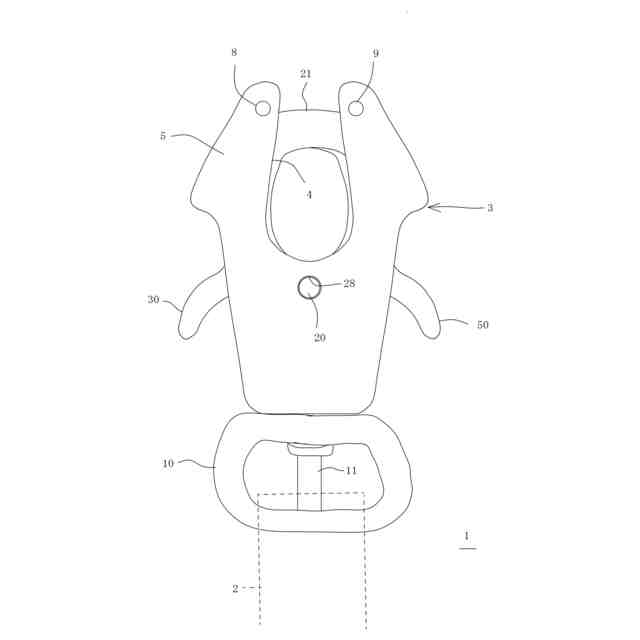 支持体3の前側プレート部5と後側プレート部7の間の空間には、前後に重ねて配設されて下部が支持体3に軸20により軸支された一対の板状の左フック体21及び右フック体41が備えられている。