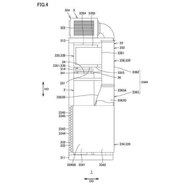 前記給気出口からの空気の吹き出し方向に沿う方向である奥行方向において、前記前部の前記給気出口とは反対側に接続される後部と、を含み、