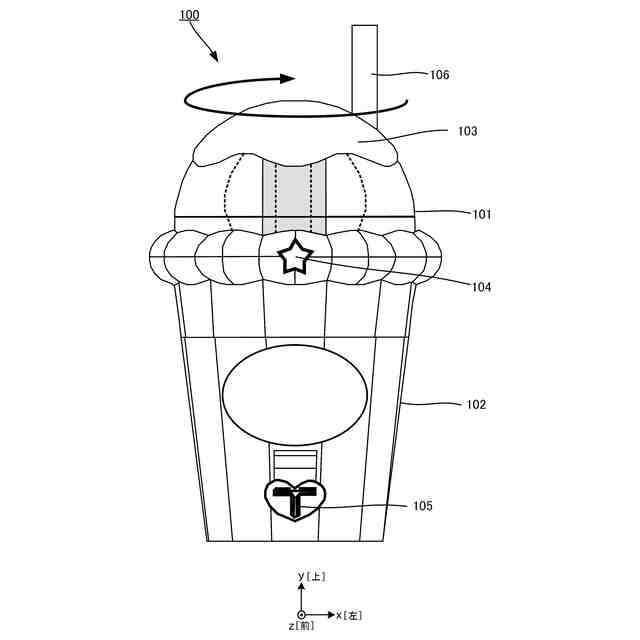 まず図1を参照して、本実施形態に係る玩具100の外観構成の一例について説明する。図1は玩具100の外観正面を示す。なお、x,y,zの矢印はそれぞれ玩具における上、左、前方向の向きを示し、他の図面についても同様である。