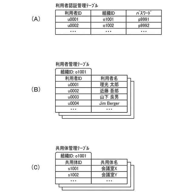 (A)は利用者認証管理テーブルの概念図、(B)はアクセス管理テーブルの概念図、(C)は予定管理テーブルの概念図である。