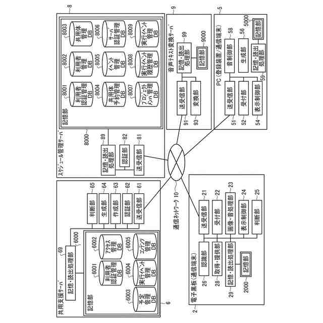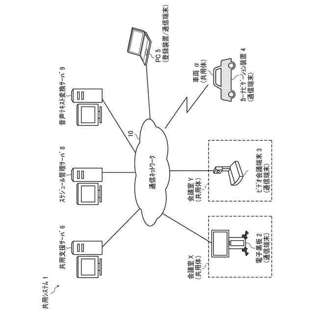 図1に示されているように、本実施形態の共用システム1は、電子黒板2、ビデオ会議端末3、カーナビゲーション装置4、PC(Personal Computer、パーソナルコンピュータ)5、共用支援サーバ6、スケジュール管理サーバ8及び音声テキスト変換サーバ9によって構築されている。