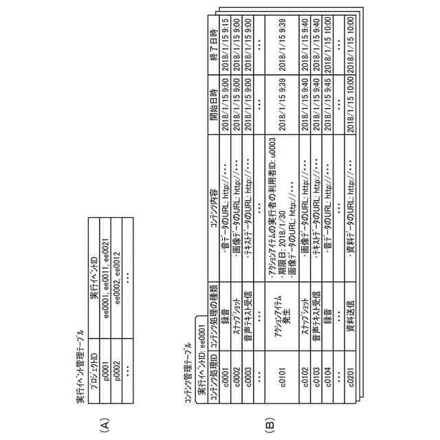 (A)は実行イベント管理テーブルの概念図、(B)コンテンツ管理テーブルの概念図である。