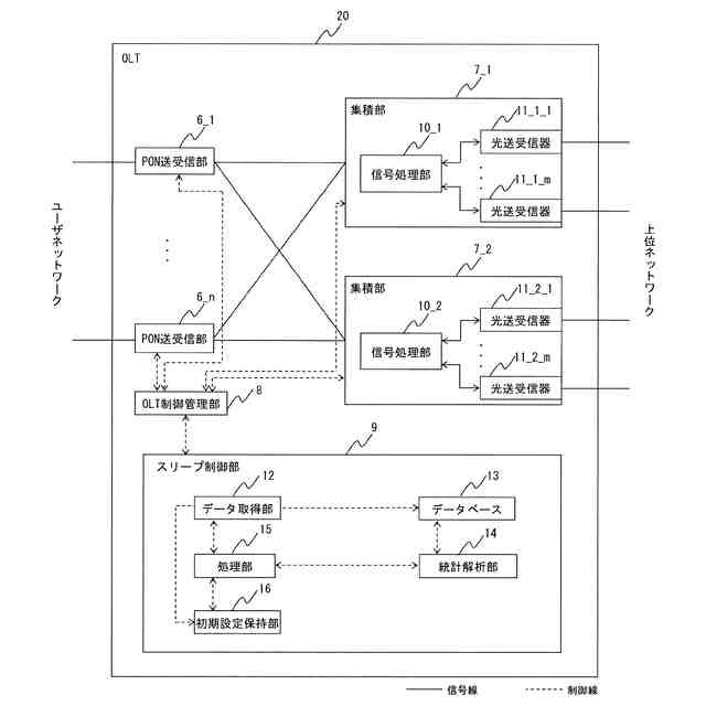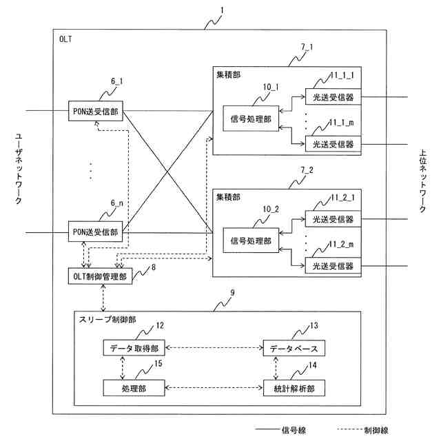近年、温室効果ガス削減の要請が高まり、PONシステムについても一層の省電力化が求められている。PONシステムの省電力化について、様々な技術が提案されている。たとえば、特許文献1では、OLTの複数のOSU(Optical Subscriber Unit、以下、「PON送受信部」と称する)を収容するスイッチ(以下、「信号処理部」と称する)を2つに分け、それぞれ信号処理部1、信号処理部2とし、OLT全体の上り信号容量が、信号処理部1の最大スイッチング容量よりも少ない値に設定された閾値を下回っている場合に、上り信号を信号処理部1に振り分け、信号処理部2及び信号処理部2に接続される物理ポート(以降、光送受信器と呼ぶ)をスリープさせることで省電力効果を得る技術が開示されている。