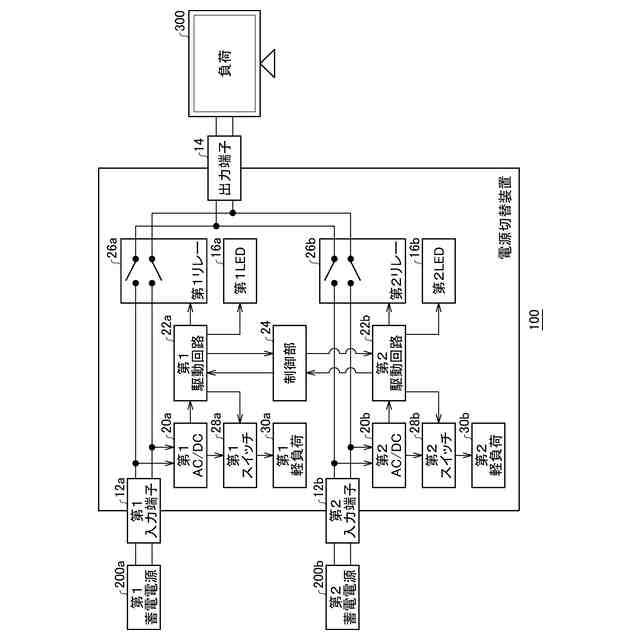 【解決手段】第1入力端子12aに第1蓄電電源200aが接続され、かつ出力端子14に負荷300が接続された場合、制御部24は、第1リレー26aを閉じることによって、第1蓄電電源200aから負荷300に電力を供給させる。第1蓄電電源200aから負荷300に電力を供給させている状態において、第2入力端子12bに第2蓄電電源200bが接続された場合、第2蓄電電源200bが第2軽負荷30bに電流を流す。制御部24は、第1蓄電電源200aからの電力の供給の停止を検知した場合、第2リレー26bを閉じることによって、第2蓄電電源200bから負荷300に電力を供給させる。