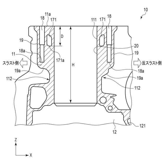 以下、本開示の一実施形態に係る車両1、シリンダ部材としてのシリンダブロック10の構成について図面を参照しながら説明する。図1は、本開示の一実施形態に係る車両を示す説明図であり、図2はエンジンの概略構成を示す説明図である。図3及び図4はシリンダブロックの断面図及び平面図である。図中X、Y、Zは互いに直交または交差する3方向をそれぞれ示す。なお、各図において説明のため、適宜構成を拡大、縮小または省略して示している。本実施形態において、ピストン13の往復動の方向に沿う第1方向がZ軸、シリンダの並列方向となる第2方向がY軸、スラスト及び反スラスト側に沿う第3方向がX軸にそれぞれ沿う姿勢でシリンダブロック10が配置された例を示す。