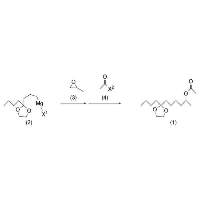 を含む、5-(2-ブチル-1,3-ジオキソラン-2-イル)-1-メチルペンチル=アセテート(1)の製造方法。