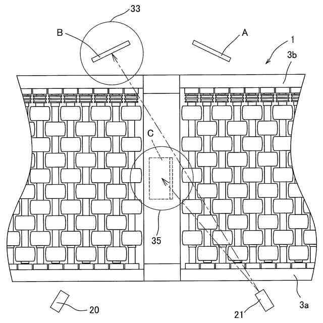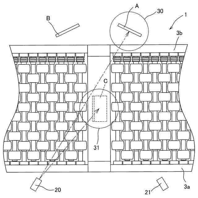 上記した各態様において、鏡は、その法線が、搬送手段の搬送方向に対して傾斜していることが望ましい。