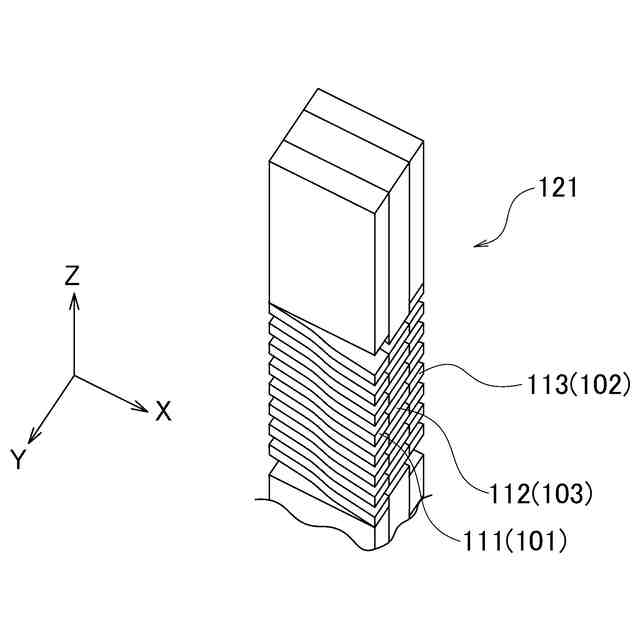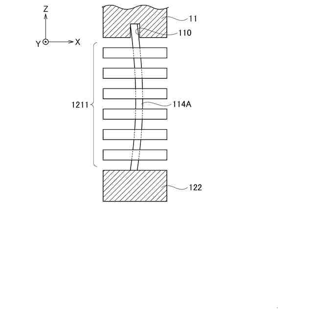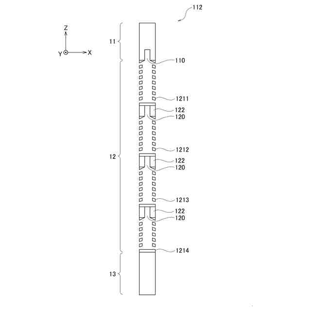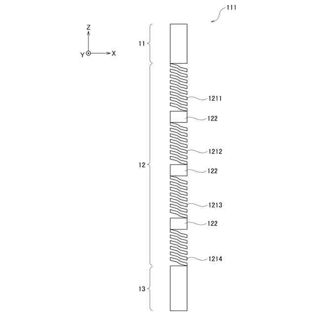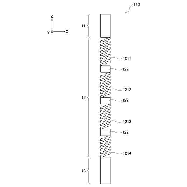 図1に示す第1の実施形態に係るプローブ10は、検査対象物の電気的特性の検査に使用される。プローブ10の軸方向の一方の端部に検査対象物に接触させる先端部11が配置され、他方の端部にランドと接触させる基端部13が配置されている。プローブ10では、先端部11と基端部13の間に、弾性を有する第1コイルスプリング部1211~第4コイルスプリング部1214が、弾性を有さない連結部122を介して軸方向に沿って連結されている。以下において、第1コイルスプリング部1211~第4コイルスプリング部1214のそれぞれを限定しない場合は、「コイルスプリング部121」と表記する。プローブ10において、先端部11と基端部13の間に位置し、コイルスプリング部121と連結部122を含む部分をバネ部12と称する。